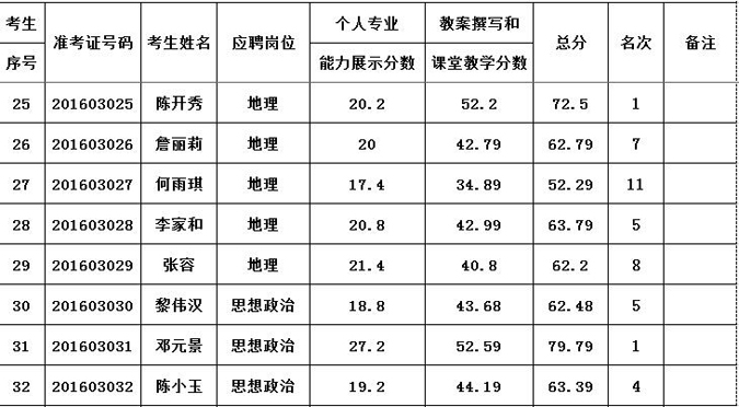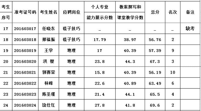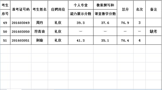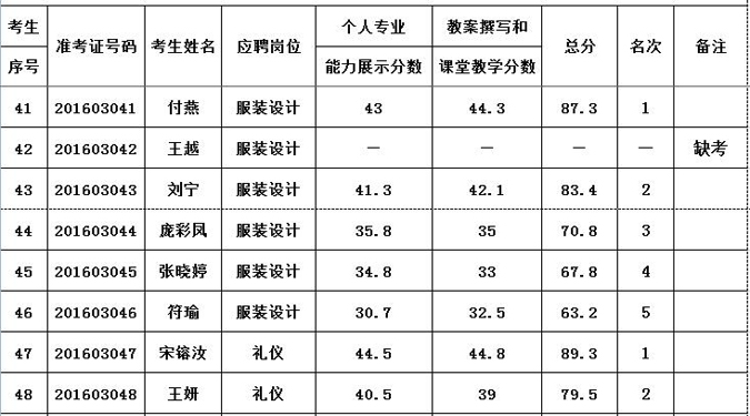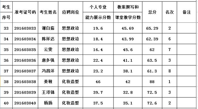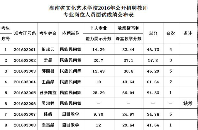 海南省文化艺术学校2016年公开招聘教师 专业岗位人员面试成绩公布表