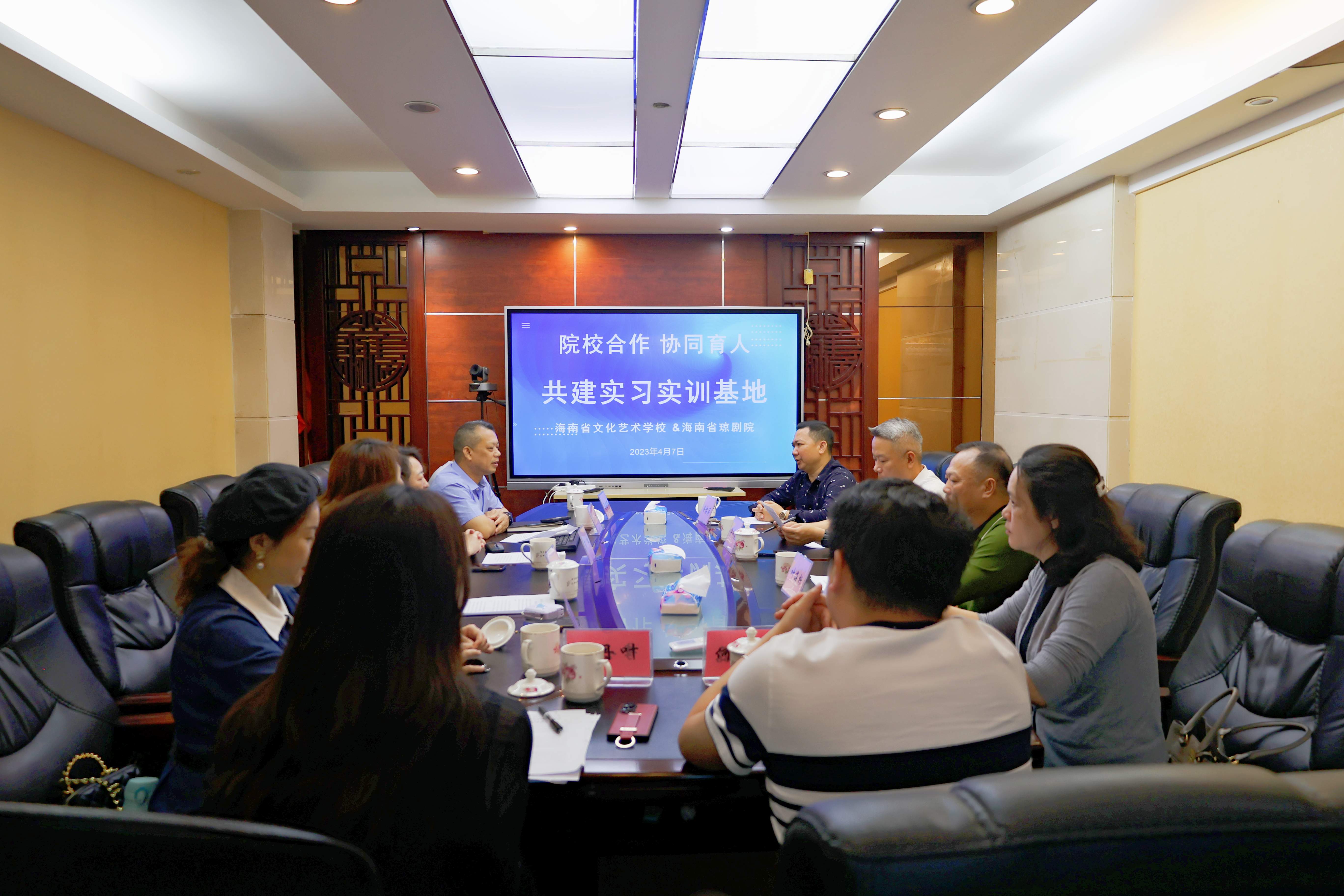双方经过愉快的交谈,初步确定在毕业生实习、就业,学术交流、学习培训、教师进修等多方面达成全方位合作的意向,提出了许多建设性意见,并举行“海南省文化艺术学校实习实训基地”揭牌仪式。
