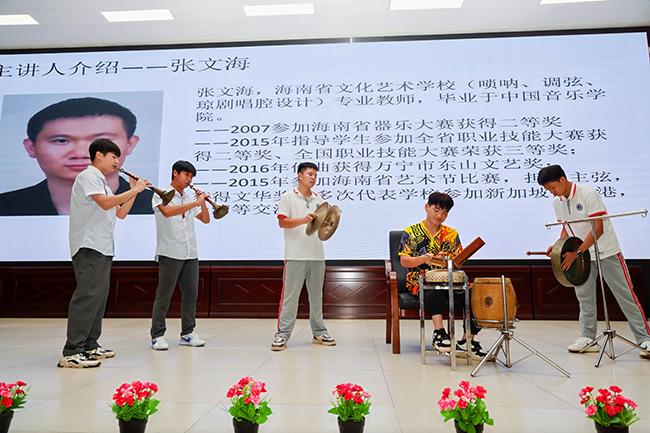 在中国乐器讲座课堂上,悠扬的旋律此起彼伏,世界杯官网器乐教研室的学生们用古筝、中阮、二胡、唢呐、笛子等民族乐器为当地师生带来了多首经典曲目并深入讲解了民族音乐作品创作、配器手法及海南八音演奏等知识。