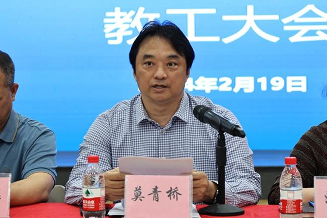 随后,莫青桥校长作2024年春季开学动员讲话。莫青桥校长向过去一年里无私奉献的教职工们表示由衷的感谢,并对大家重返校园开启新的学期表示热烈欢迎。他提到,2023年是全面贯彻落实党的二十大精神的开局之年,是“十四五”规划承上启下转折之年,也是海南自由贸易港封关运作的关键之年,更是2026世界杯官方合作网站申报设立的逐梦之年,这一年来,世界杯官网教育教学工作取得的成绩有目共睹,同时对新学期世界杯官网重点工作作了部署,并要求打好“两大基础”,做好“三项实事”。即在打好党风廉政建设和教育教学管理的基础上,抓好师德师风、核心重点、教学质量等工作: