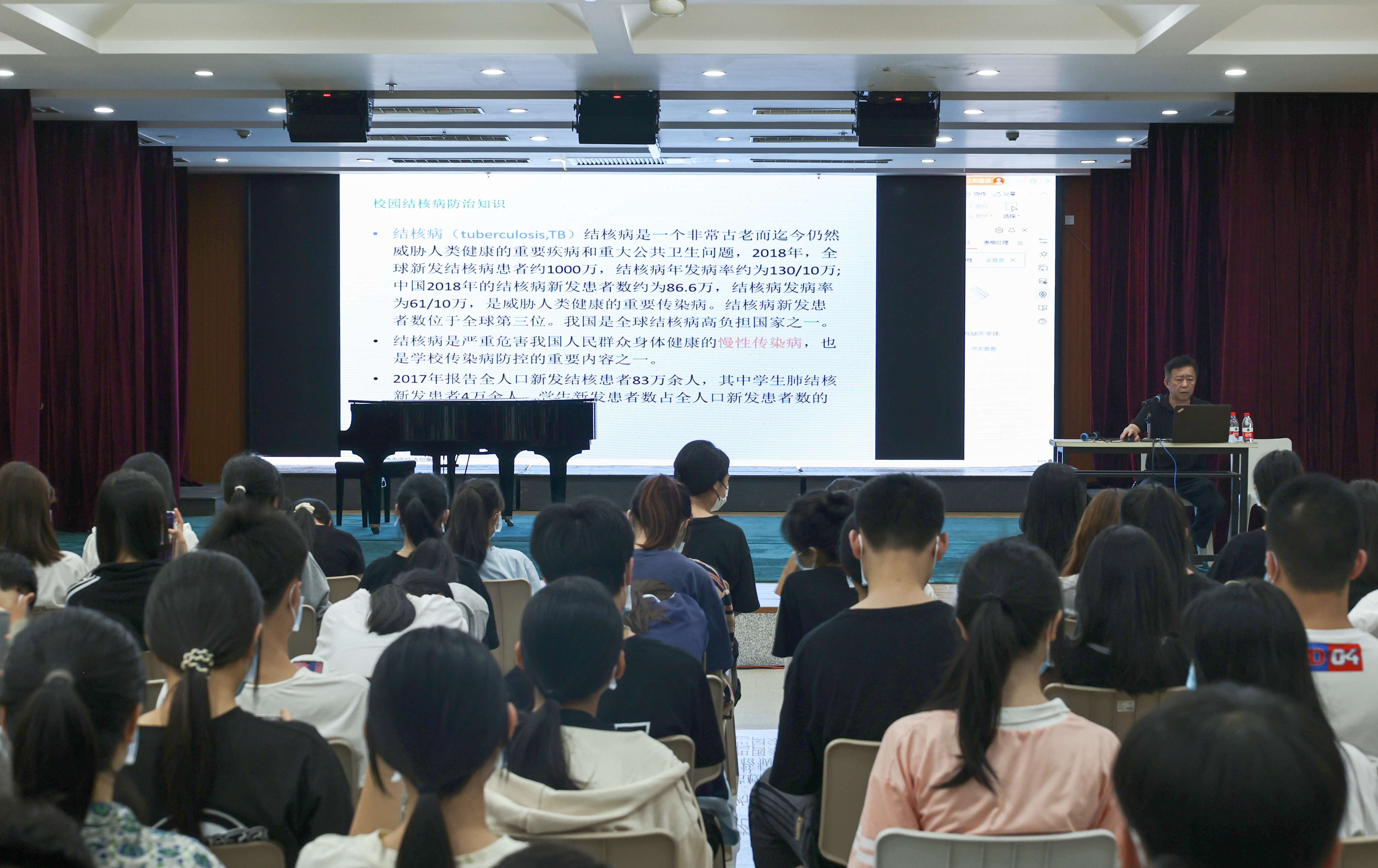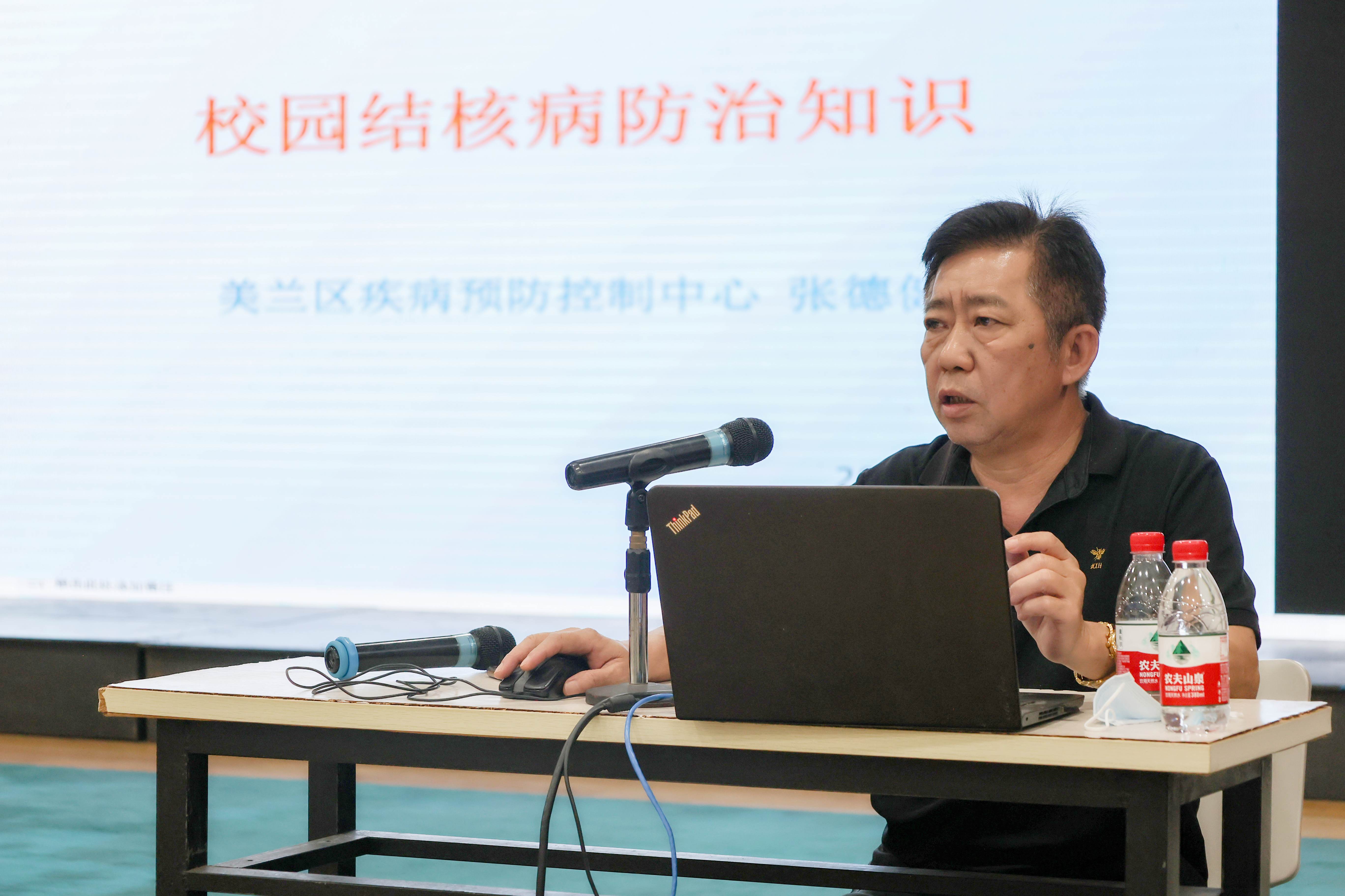 随后,海口市美兰区疾病预防控制中心张德建主任重点针对校园结核病防治展开专业介绍,从“什么是结核病”、“肺结核的危害”、“肺结核是如何传播的”、“国家主要免费政策”等几个方面对结核病进行了详细的讲解,提升和拓宽了学生对结核病的认识和了解。他呼吁同学们加强身体锻炼,在日常生活中做到不随地吐痰,咳嗽、打喷嚏时掩住口鼻,保证充足的睡眠,合理膳食,保持良好的生活规律和个人卫生习惯,有效抵御结核病。张德建主任还建议学校重视预防工作,如新生入学开展结核病检查、加强疫情监测、进行结核病健康教育、做好通风和校园卫生等,做到早发现、早隔离、早诊断、早治疗,有效地阻断结核病的流行与传播。