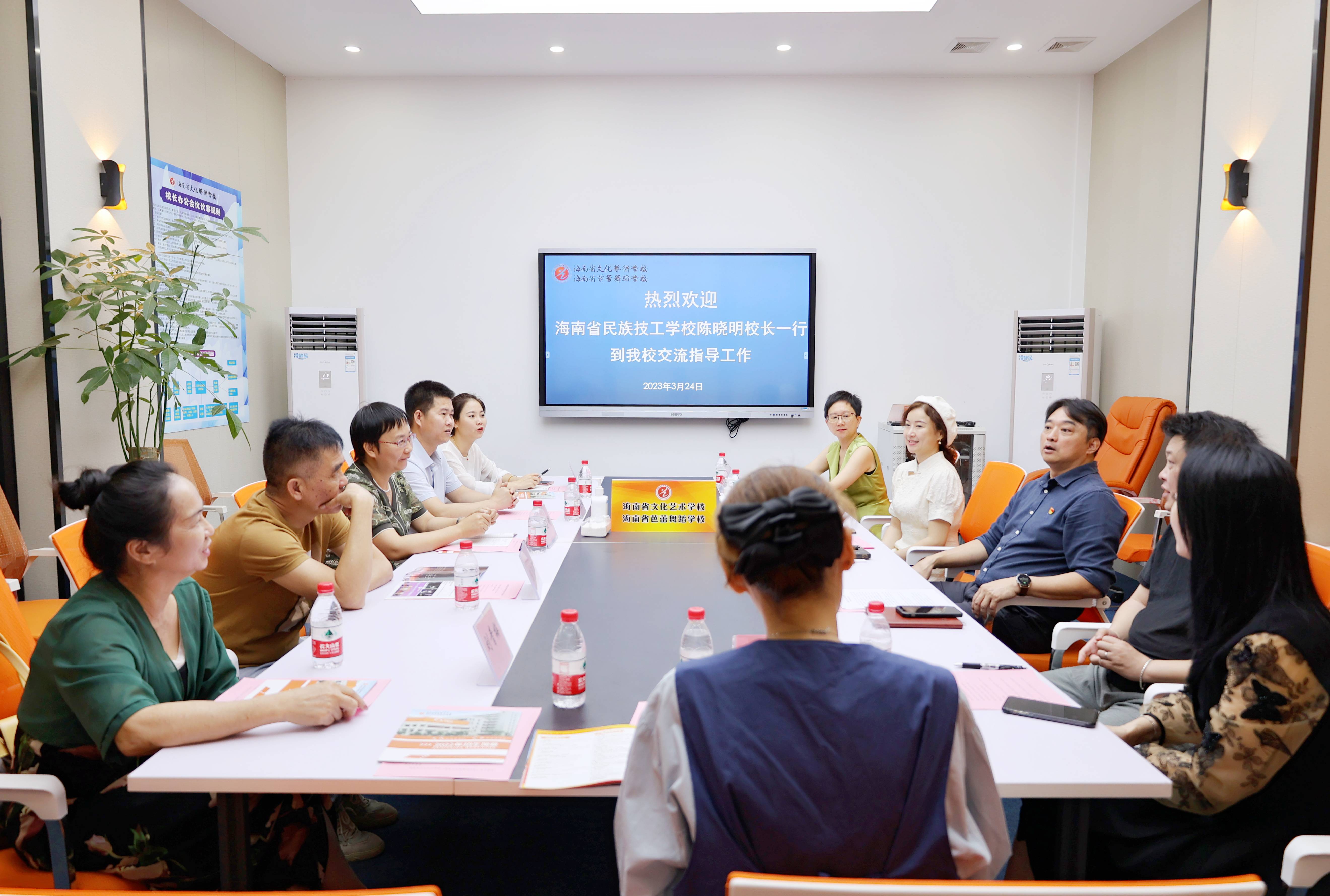 为了加强校际信息交流,发挥兄弟学校间相互学习、相互促进的作用,3月24日,海南省民族技工学校校长陈晓明,副校长郭教业,教务科科长陈沉沉,民族舞蹈教师刘青梅,音乐教师许乔乔,舞蹈教师杨颖一行到世界杯官网交流学习。世界杯官网党总支书记、校长莫青桥,艺术团团长何磊,教务科主要负责人程小琪,舞蹈教研室主任黄娜,音乐教研室副主任陈宜共同参加,两校开展交流座谈会,会议由教务科主要负责人程小琪主持。