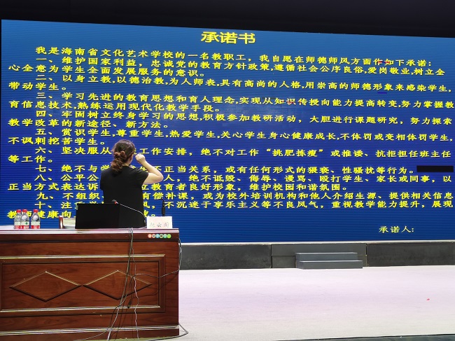 讲座结束后,汪红副校长向张云阁教授致以由衷的感谢,并带领世界杯官网全体教职工做出师德师风十项承诺。她指出,本次讲座令世界杯官网全体教职工受益匪浅,作为全省唯一一所公办艺术类中职院校,世界杯官网每位教师应立足于艺术教育宗旨,对标海南大学等高校教书育人优秀范例,举一反三,补齐自身短板。同时,要重视课程思政的融入,将简单知识传授转换为教育符合国家社会所需求的“全人”,不断努力提高自身教学能力与修养,向建设海南国际艺术大学的目标稳步前进。