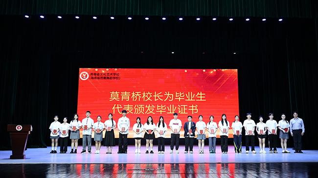 最后,莫青桥校长发表了真挚动人的致辞,代表学校为2024届毕业生送上祝福,一句一行,饱含热烈情感。他表示,在艺校求学的岁月里,同学们用灿烂的青春和满载的收获留下了“海艺记忆”,用实际行动书写了艺校学子的溢彩华章。展望未来,他寄语同学们一要以诚为做人之本,以毅为立身之道,到真实的世界中汲取力量、辨清方向、成就自己;二要树立规则意识,恪守规则做事,坚守责任意识,勇于担当做人。他希望同学们牢记母校“明德、善美、精艺、进取”的校训,慨然以赴、挺身向前,热烈地朝着前方奔跑!