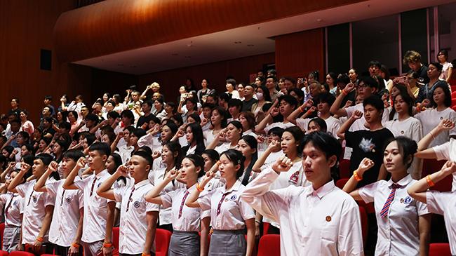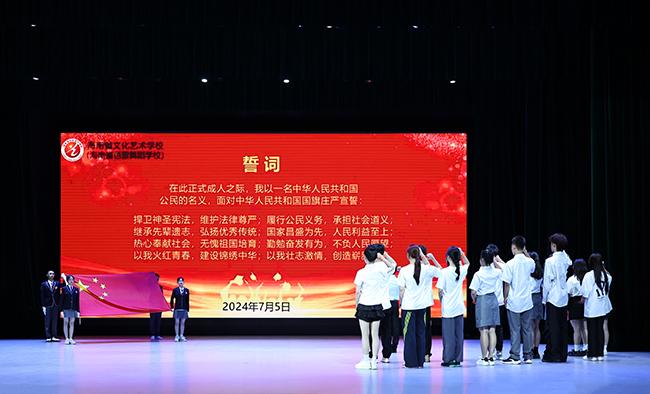 面向国旗,团委副书记邓元景带领全体毕业生宣读誓词,进行成人宣誓。铮铮誓词,激励着每一位同学将个人理想融入党和国家事业,将自身成才厚植于民族复兴伟业。