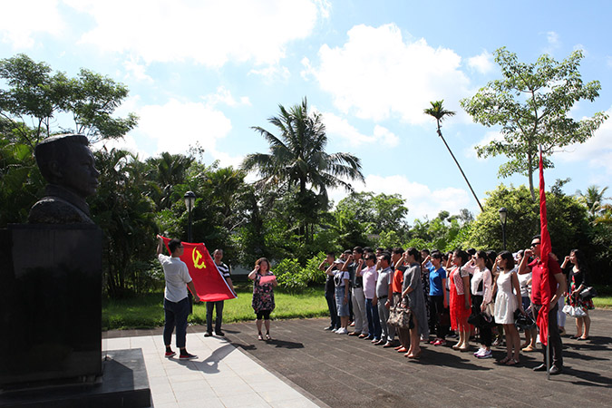 当日上午,在义务讲解员冯先生的带领下,我们进入故居,首先看到的是 “二十三年红旗不倒”几个苍劲有力的大字,在纪念碑前,冯先生详细地介绍了冯白驹将军的生平。在随后的参观活动中,一幅幅历史照片、一件件珍贵文物映入参观党员眼帘,通过解说员的声情并茂讲述,全体党员对冯白驹的革命精神、革命生涯有了更深刻了解,使党员们思想得到了洗礼,心灵受到了震撼,倾刻间仿佛我们已回到那个战争年代,看着冯将军为解放事业奋斗的身影,心里油然而生一股敬意。参观结束前,全体党员集结在冯白驹将军雕像前,右手握拳,面对鲜红的党旗,在教学党支部书记、副校长汪红的领誓下,重温了入党誓词。